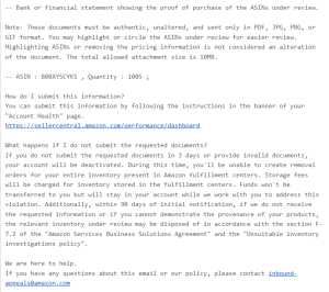 Compliance documentation is also a frequent problem area. Certain categories require safety reports, test results, or certifications. If Amazon requests documents such as a Certificate of Analysis, safety data sheet, or lab test report and the seller fails to provide valid and current documents, the listing may be deactivated until compliance is confirmed.